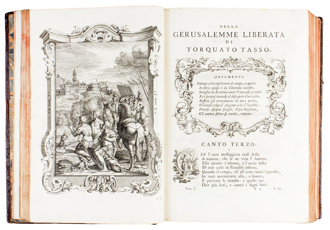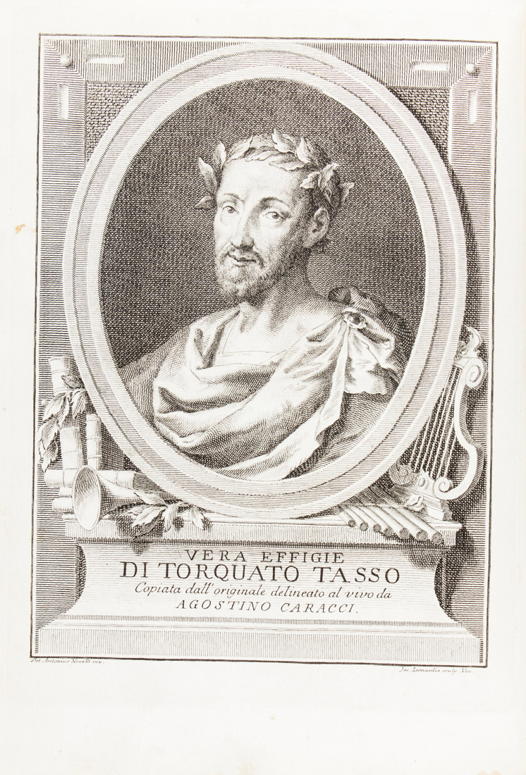 2 parti in 1 volume in-4° (mm 291x215). Pagine [2], XXX, 364; XII, 360 con 1 bella antiporta allegorica, 1 ritratto dell'Autore a piena pagina e 20 tavole fuori testo entro elaborate bordure ornamentali, il tutto finemente inciso in rame da Leonardis. Frontespizio in inchiostro rosso e nero con vignetta, capilettera istoriati, bordure ornamentali per gli Argomenti in principio di ciascun canto e 95 vignette nel testo sempre incise in rame da Leonardis. Ottima copia. Legatura coeva in piena pelle maculata con titoli dorati su tassello e decorazioni floreali impresse in oro ai comparti del dorso a 5 nervi; restauri e reintegri ai piatti e al dorso, difetti alle cerniere e altri segni d'uso.
