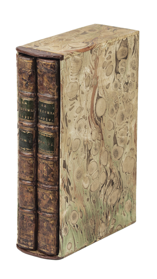 2 volumi in-8° (mm 220x138). Pagine [4], CVIII, 128; [2], 239, [1] di errata. Con 2 frontespizi incisi, 1 antiporta allegorica al primo volume, 1 ritratto dell'Autore a mo' di testatina in apertura della Vita, 12 tavole fuori testo, 12 en-têtes e 12 culs-de-lampe, anche a piena pagina. Ottimo esemplare in carta azzurrina con le tavole in fresca e nitida tiratura. Legatura coeva in piena pelle maculata con cornici dorate di triplice filetto ai piatti e titoli impressi in oro su tassello al dorso. Rotture alle cerniere ben restaurate. Conservato in cofanetto.(2)