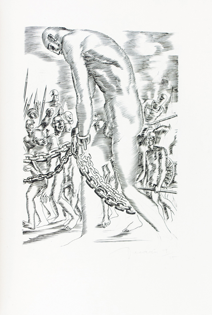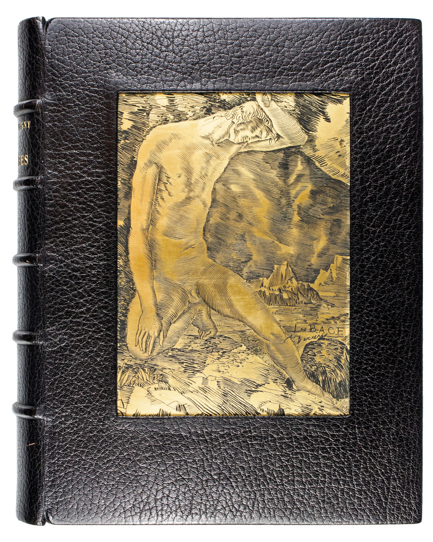In-4° (mm 330x250). Pagine XVII, [2], 175, [15], [18] (Supplément di Pierre Bellanger) con 46 bulini originali di Decaris nel testo, di cui 16 a piena pagina, 14 schizzi originali a matita nera e una suite (la nostra la n. 3 di 15) su carta Chine fort con 18 épreuves des grandes compositiones. Esemplare n. 24 per Hugues Citroën di una tiratura a sole 128 copie su velin de Hollande blanc. Timbro a secco dell'editore alle pagine. Legatura firmata Canape e Courriez in marocchino nero con una delle lastre originali incastonata nel piatto anteriore, firmata dall'Artista, titoli impressi in oro al dorso, doublures in marocchino rosso contornate da filetto dorato e sguardie in seta; brossura editoriale conservata. Entro custodia in cartonato, un poco lisa.