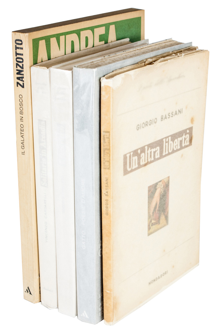 In-16° (mm 190x125). Pagine 196. Esemplare in ottimo stato. Brossura editoriale. SI AGGIUNGONO: Bassani Giorgio, Un'altra libertà. Verona: Mondadori, 1951. Scotellaro Rocco, È fatto giorno. Verona: Mondadori, 1954. Gatto Alfonso, Poesie d'Amore. Milano: Mondadori, 1973. Zanzotto Andrea, Il galateo in bosco. Milano: Mondadori, 1978. (5)