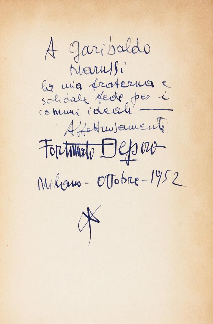 In-8° (mm 226x160). Carte [38] con 34 illustrazioni in 17 carte di tavole, di cui una a colori in antiporta protetta da velina con didascalia, il resto in bianco e nero. Brossura editoriale stampata al piatto anteriore in rosso e nero, un po' scolorita nel margine superiore. Dedica autografa di Depero a Garibaldo Marussi al primo foglio bianco datata Milano, Ottobre 1952.