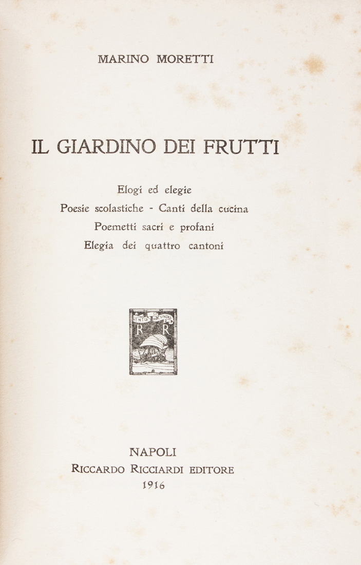 Moretti Marino, Il giardino dei frutti.Napoli: Ricciardi, 1916.In-8° (mm...