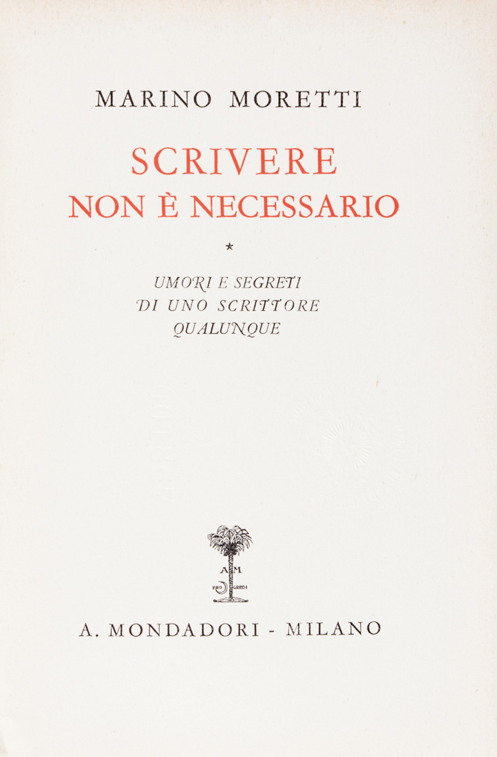 Moretti Marino, Scrivere non è necessario.Milano: Mondadori, 1938.In-8°...