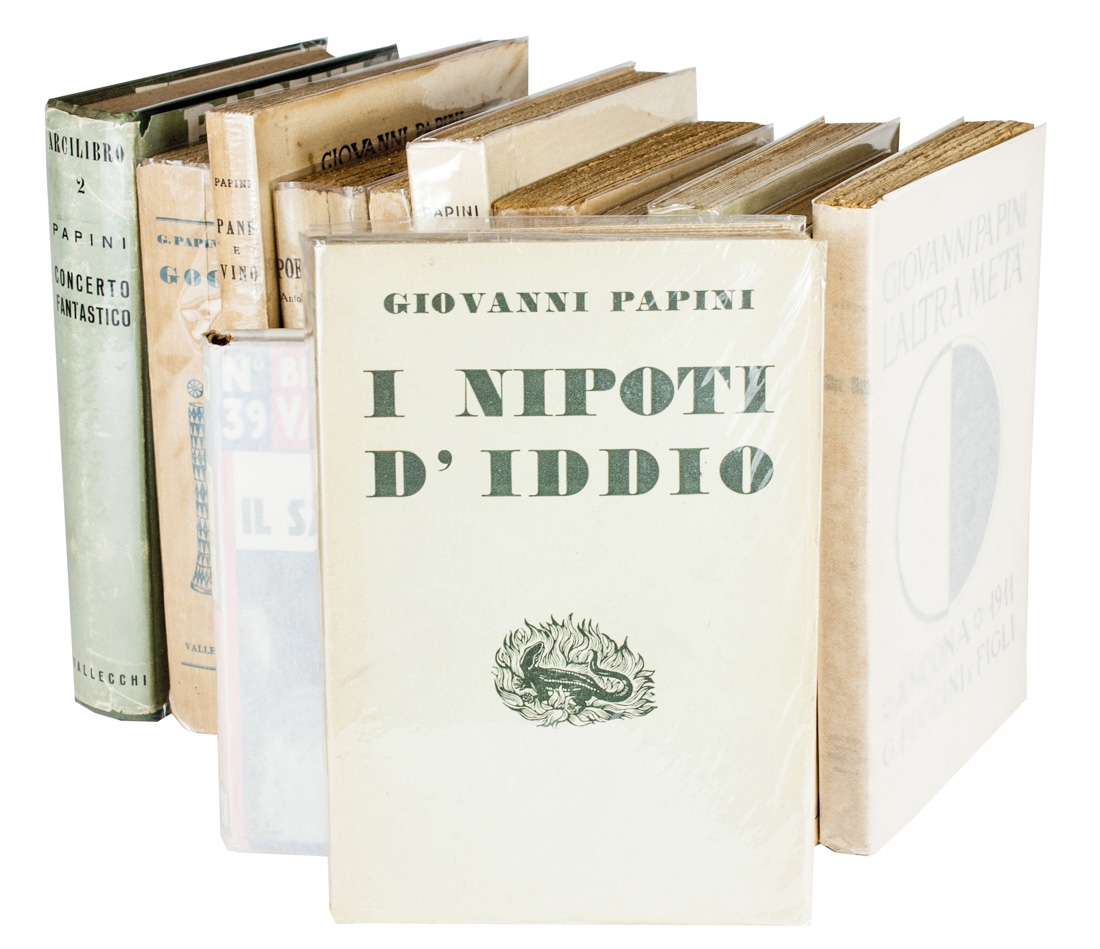 In-8° (mm 200x130). Pagine 191, [1]. Esemplare in barbe con fioriture sparse. Brossura editoriale con qualche gora d'acqua ai piatti. SI AGGIUNGONO: Id., Parole e sangue. Napoli: Perrella, 1912. Poeti d'oggi. Firenze: Vallecchi, 1920. Giorni di festa. Firenze: Libreria della Voce, 1919. Pane e Vino. Firenze: Vallecchi, 1926. Gli operai della vigna. Firenze: Vallecchi, 1929. Gog. Firenze: Vallecchi, 1931. I nipoti d'Iddio. Firenze: Vallecchi, 1932. Ritratti Stranieri VOL XI. Firenze: Vallecchi, 1932. Il sacco dell'orco. Firenze: Vallecchi, 1933. La pietra infernale. Brescia: Morcelliana, 1934. Cielo e Terra. Firenze: Libreria Editrice Fiorentina, 1943. Concerto Fantastico. Firenze: Vallecchi, 1954. (13)
