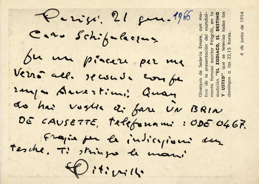 Pitigrilli [pseud. di Dino Segre], Cartolina con autografo di Pitigrilli.