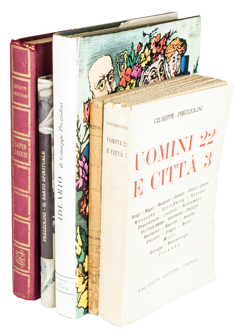In-8° (mm 200x145). Pagine XXVIII, 131. Esemplare in barbe su carta forte. Qualche fioritura, altrimenti ottime condizioni. Legatura cartonata con tassello al piatto anteriore. SI AGGIUNGONO: Id., Cos'è il Modernismo? Milano: Treves, 1908. Uomini 22 e città 3. Firenze: Vallecchi, 1920. Saper leggere. Milano: Garzanti, 1965. Ideario. In Milano: Edizioni del Borghese, 1967.(5)