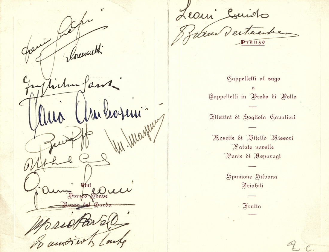 I menù sono relativi alla "Premiazione Pirelli dei campioni motociclisti del Mondo e d’Italia 1950" e all' "Incontro col brivido. Autodromo di Monza 25 ottobre 1952". Si leggono le firme di Manuel Fangio, Alberto Ascari, Gianni Brera, Nello Pagani, Alano Montanari, Umberto Masetti, Gianni Leoni, Bruno Ruffo, Dario Ambrosini, Enrico Lorenzetti, Guido Leoni, Carlo Ubbiali (?). Dimensioni varie.(2)