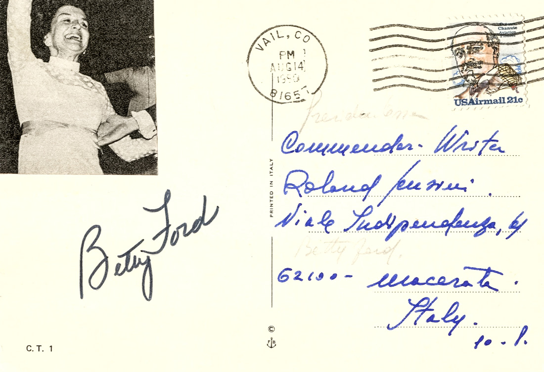 Firme autografe di Mamie Doud Eisenhower (cartolina con busta), Lilian Carter (su cartolina), Betty Ford (su cartolina), Barbara Bush (breve lettera dattiloscritta con firma autografa e con busta e cartolina).