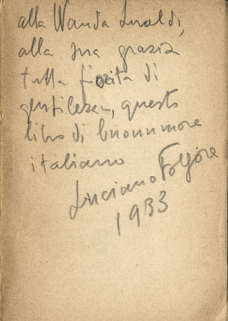 La raccolta comprende: Malaparte Curzio. Storia di domani. Roma, Aria d'Italia 1949 (Dedica, data e firma autografa) - Luciano Folgore. Poeti allo specchio. Parodie - Seconda serie (Terza edizione). Foligno-Roma, Campitelli 1931 (Dedica, data e firma autografa) - Negri Ada. Vespertina. Milano, Mondadori 1930 (Dedica, data e firma autografa) - Papini Giovanni. La corona d'argento. Istituto di Propaganda libraria (Dedica, data e firma autografa) - Benelli Sem. Un figlio dei tempi. Roma, Casa editrice Nazionale […] 1905 (Dedica e firma autografa) - Cardarelli Vincenzo. Il sole a picco. Con disegni di Morandi. L'italiano editore (Dedica, data e firma autografa) - Centonze Nené. Canzoni senza cuore. Milano, Atlante 1932 (Dedica, data e firma autografa) - Baldini Antonio. Umori di gioventù. Firenze, Vallecchi 1920 (Dedica e firma autografa) Fracchia Umberto. Piccola gente di città. Milano, Mondadori 1925 (Dedica, data e firma autografa) - Personé Luigi. L'arte di saperla lunga. Firenze, Mazza 1952 (Dedica e firma autografa).(10)