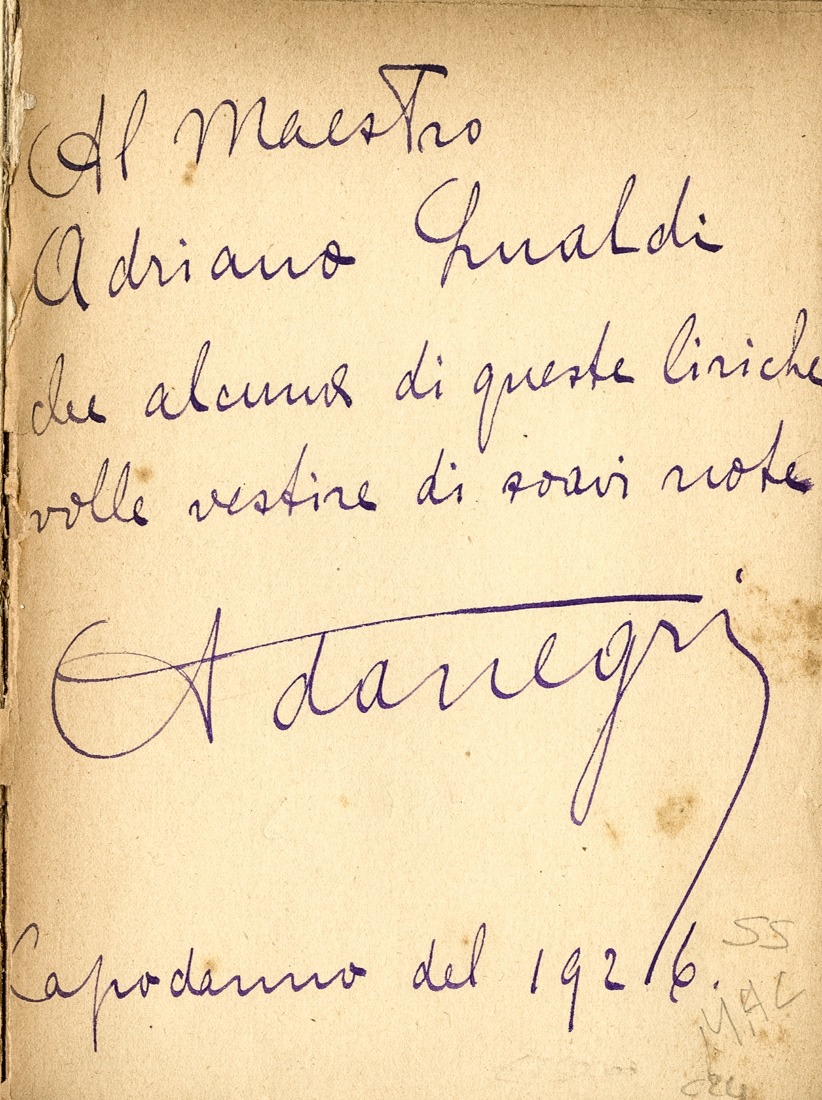 La raccolta comprende: Spadolini Giovanni. Il '48. Firenze, L'Arco 1948 (Lunga dedica, data e firma autografa) - Bacchelli Riccardo. Mal d'Africa. Milano, Treves 1935 (Dedica, data e firma autografa) - Capasso Aldo. Il passo del cigno. Prefazione di Ungaretti. Torino, Buratti 1931 - Aleramo Sibilla. Sì alla terra. Milano, Mondadori 1935 (Dedica, data e firma autografa) - Sacchetti Enrico. 2 baci. Milano, Treves c1936 (Dedica, data e firma autografa) - Papini Giovanni. La vita di Michelangiolo nella vita del suo tempo. Milano, Garzanti 1950 (Dedica, data e firma autografa) - Negri Ada. I canti dell'isola. Milano, Mondadori 1924 (Dedica, data e firma autografa) - Viviani Alberto. Gianfalco. Firenze, Barbera 1934 (Dedica e firma autografa) - Gamba Francesco. Il viatico. Varese, Casa dei poeti 1925 (es. 53 di 550) (Dedica, data e firma autografa).(9)