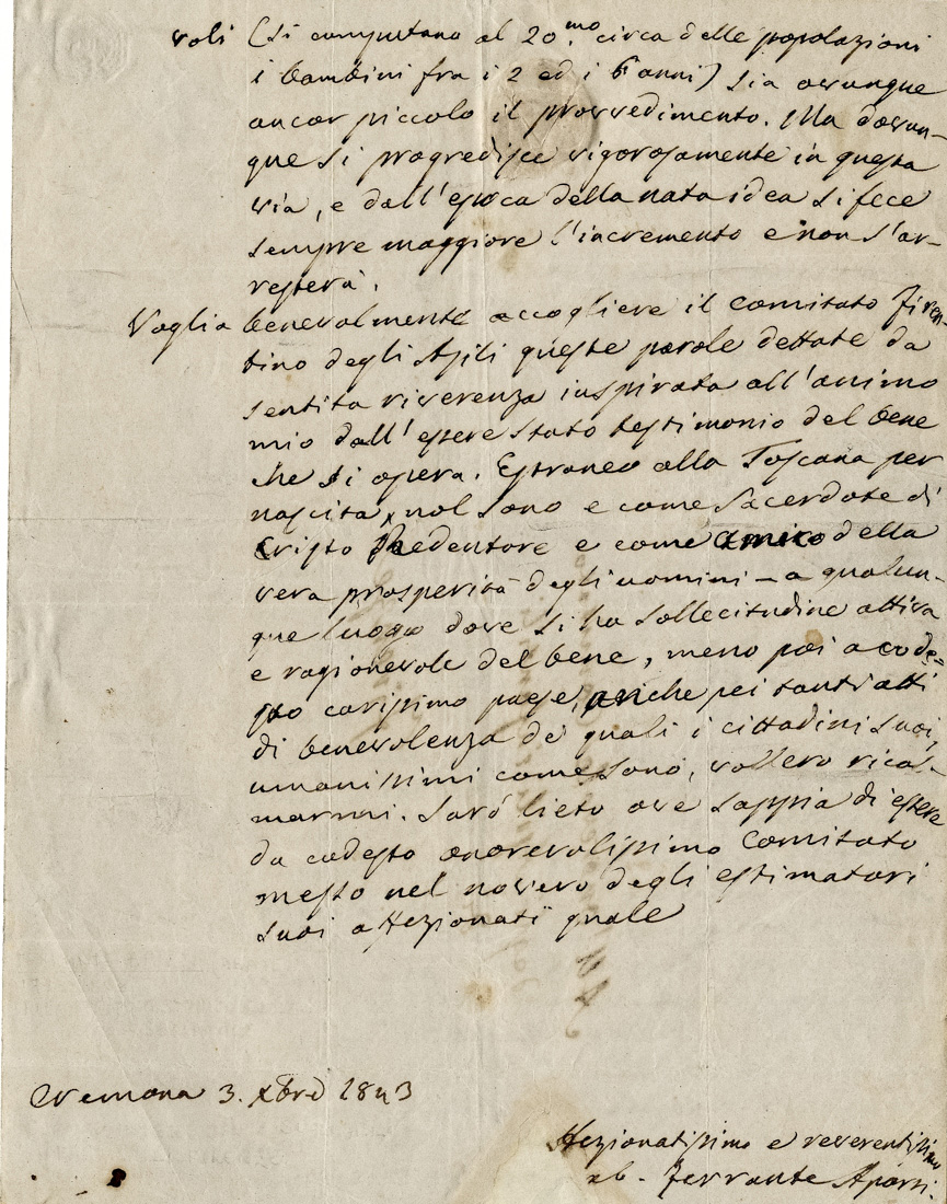 Aporti Ferrante, Lettera autografa firmata inviata 'All'onorevole Comitato degli Asili Infantili di Firenze'.