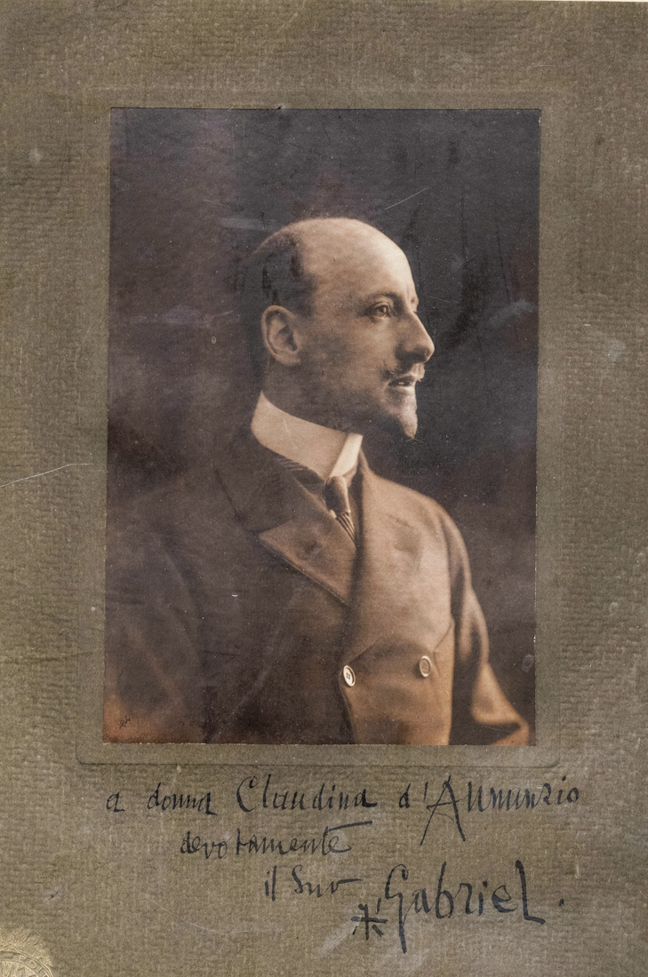 "A donna Claudina D'Annunzio / divotamente / il Suo / Gabriel". In cornice. Dimensioni della fotografia: 245x345 mm. Dimensioni della cornice: 400x411 mm.