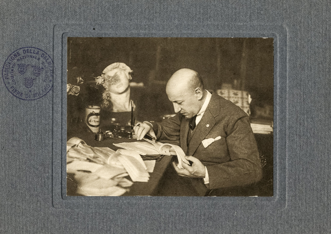 La fotografia ritrae lo scrittore a mezzo busto, seduto alla scrivania, mentre sfoglia un piccolo album. Ritratto applicato su cartoncino. Con timbro "Fiera di Milano, Padiglione Dalmazia / Comitato Nazionale Dalmazia". Dimensioni della fotografia: 137x107 mm. Dimensioni del supporto: 167x240 mm. SI AGGIUNGONO: Id., 1 verso con firma autografa "Giardini chiusi, appena intraveduti! […]". 1 telegramma inviato ad Adriano Lualdi "Leggo il grazioso articolo e penso che sia omai inutile spedire il papiello […]".(3)