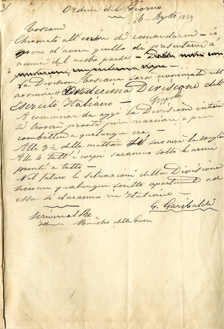 Garibaldi Giuseppe, Ordine del giorno autografo firmato con correzioni e cancellature.