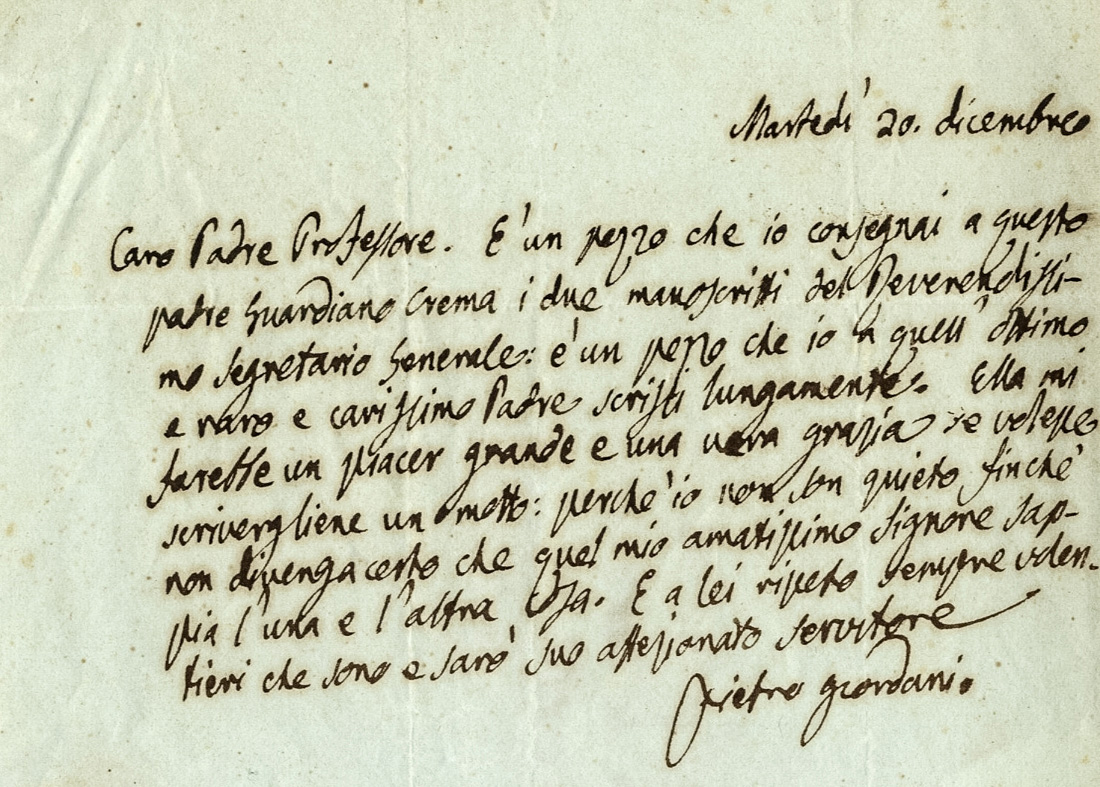 Giordani Pietro, Lettera autografa firmata inviata al Padre Benedetto da Joro.