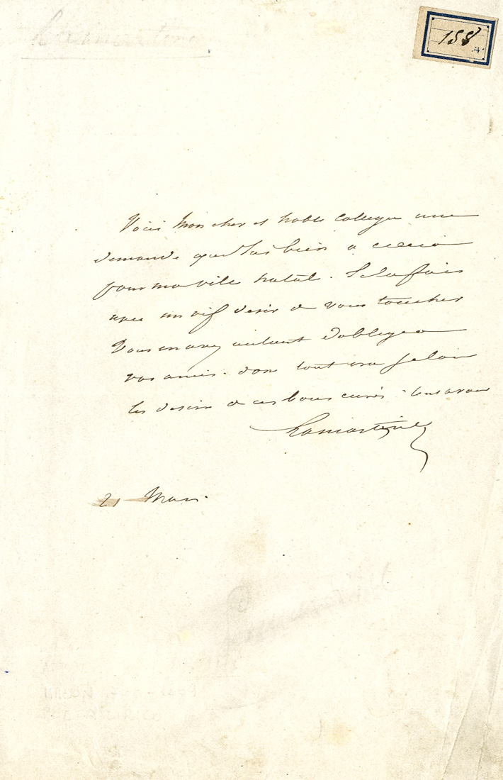 Lamartine Alphonse (de), Lettera autografa firmata.Non datata.Manoscritto a...