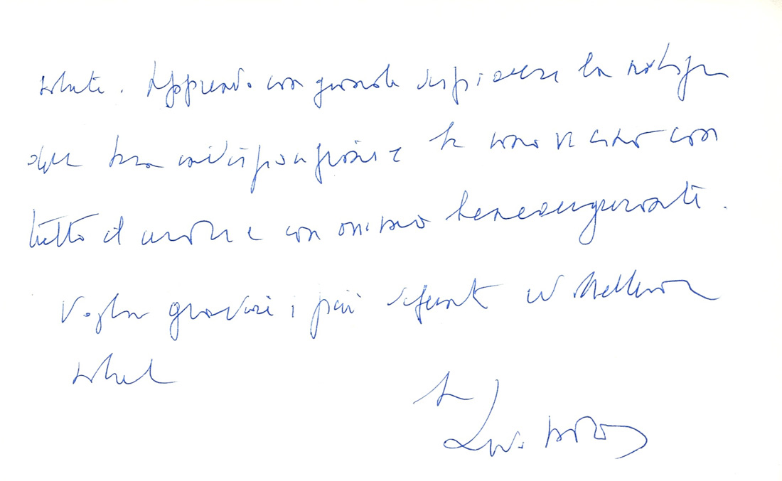 Manoscritto a inchiostro blu. 1 carta, scritto il recto. Carta con intestazione "Il Presidente / del Consiglio dei Ministri". Dimensioni: 110x165 mm.