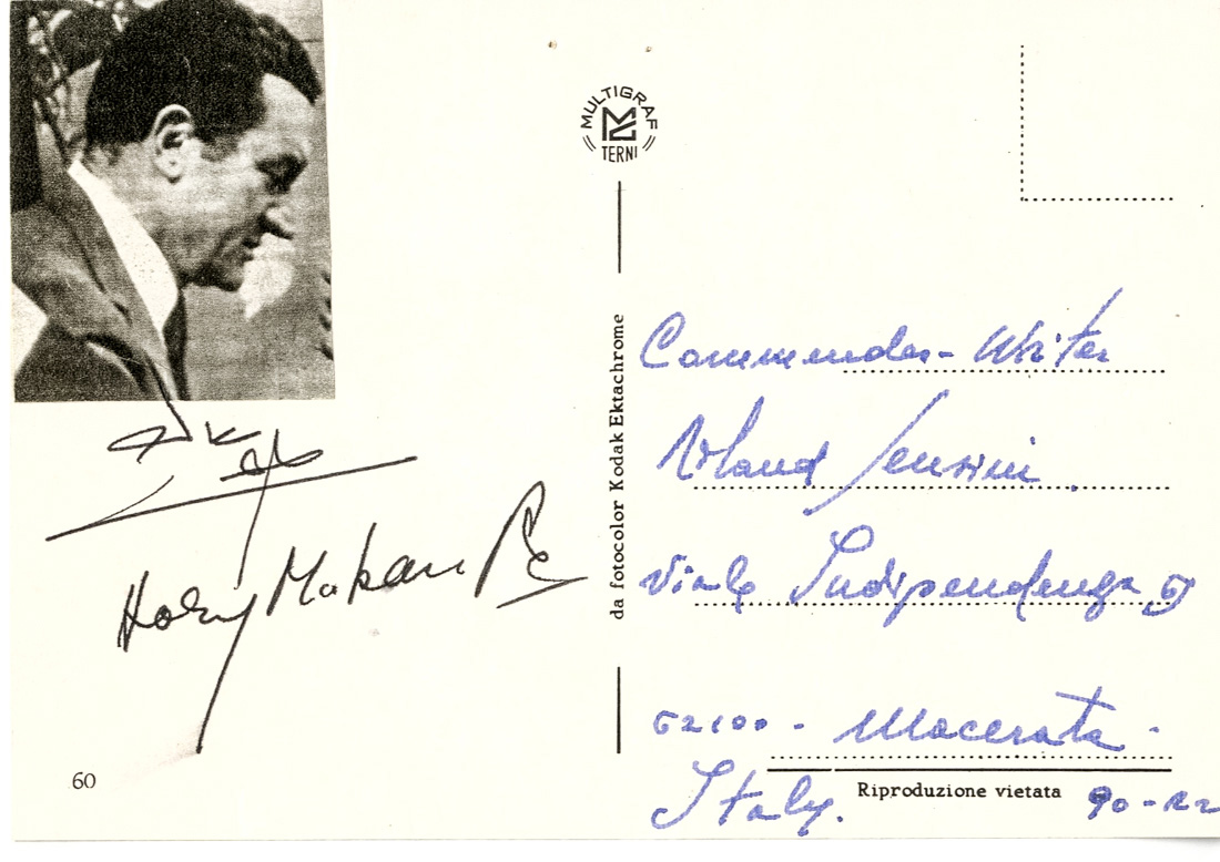 Firma a penna nera. Alla cartolina è allegata una lettera dattiloscritta su carta intestata "Arab Republic of Egypt / President of Republic" datata 3 aprile 1984 (Cairo) nella quale si legge: "[…] it pleases me to enclose herewith the card you have sent after being signed by His Excellency President Mubarak […]". La lettera è firmata da Soheil Lasheen, Direttore del dipartimento delle pubbliche relazioni. Busta originale con francobolli conservata.(2)