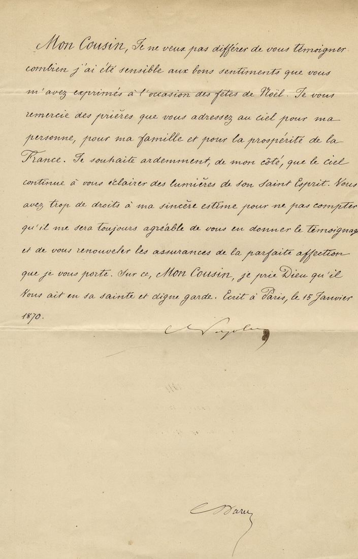 Napolèon III - Imperatore dei francesi, Lettera con firma autografa inviata al cardinale Mertel.