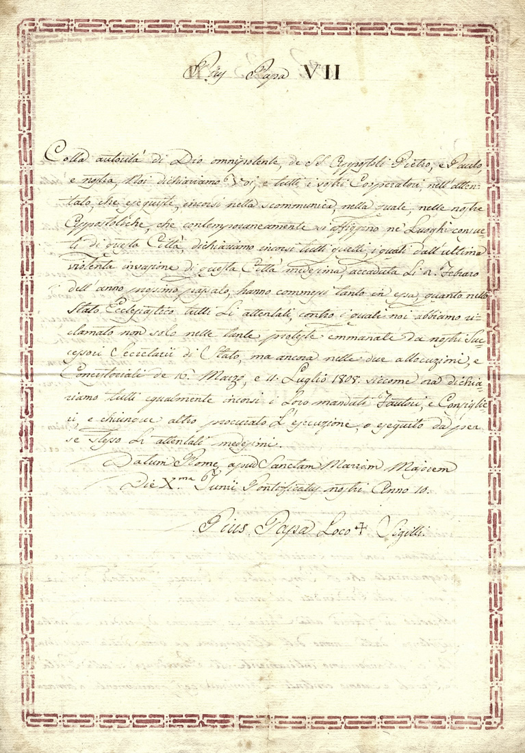 Papa Pio VII, Documento di scomunica nei confronti delle truppe napoleoniche 'depredatori del patrimonio di Pietro'.