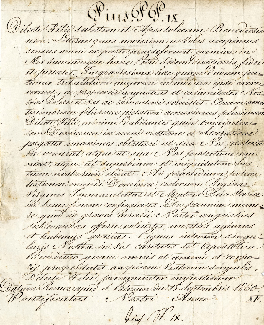 Papa Pio IX, Lettera manoscritta con firma autografa inviata a Ludovico Leoni.