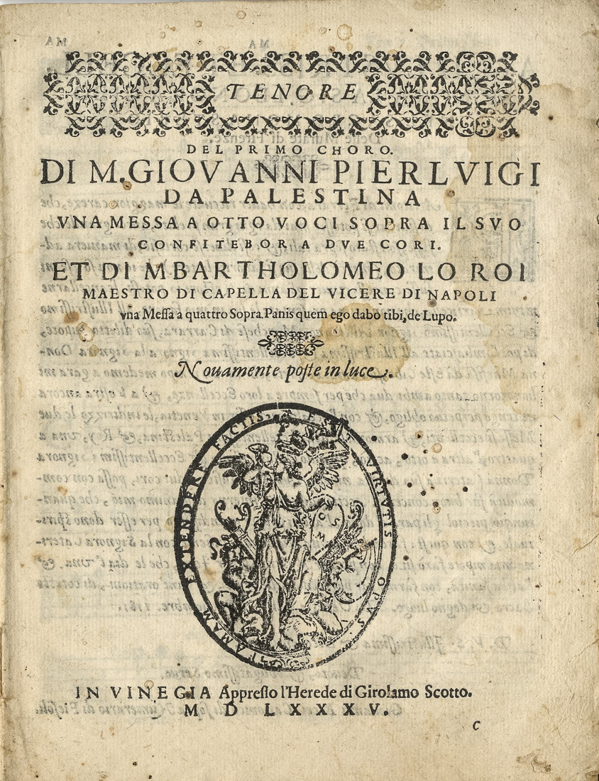 Pierluigi da Palestrina Giovanni, Roy Bartolomeo, Tenore del Primo Choro (Alto del Primo Choro, Basso del Primo Choro) / Di M. Giovanni Pierluigi / da Palestina (sic) / una Messa a otto voci sopra il suo / Confitebor a due Cori.