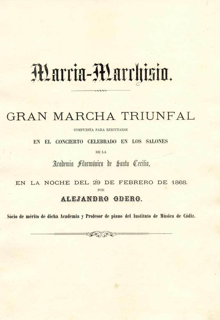 Gran Marcha Triunfal / Compuesta para ejecutarse / en el concerto celebrado en los salones / de la / Academia Filarmònica de Santa Cecilia / en la noche del 29 de febrero de 1868 / por / Alejandro Odero / Sòcio de mérito.