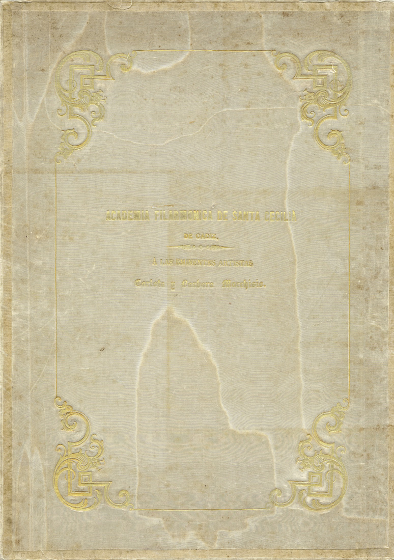 Manoscritto musicale. Partitura. Manoscritti a inchiostro nero su carta con 18 pentagrammi. Doppio frontespizio (uno illustrato) e dedica a stampa. Il testo musicale è invece manoscritto. Legatura in seta chiara (con alcuni difetti) con titoli e fregi in oro. Uno dei primi documenti della storia del Conservatorio di Cadice. Dimensioni: 380x275 mm circa.