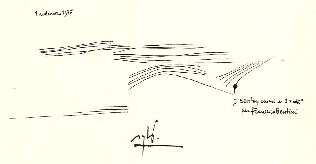 Bussotti Sylvano, 1 disegno musicale siglato dal titolo '5 pentagrammi e 1 nota' e 1 biglietto autografo siglato.