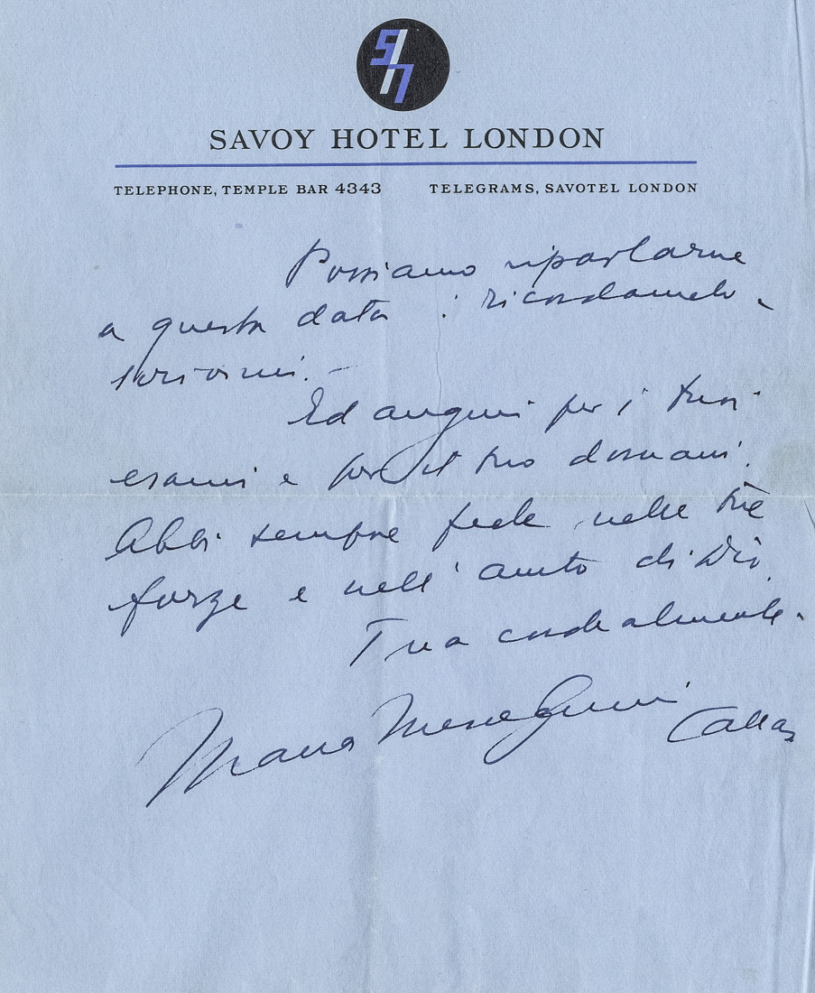 Callas Maria, Lettera manoscritta firmata 'Maria Meneghini Callas' inviata ad un amico.