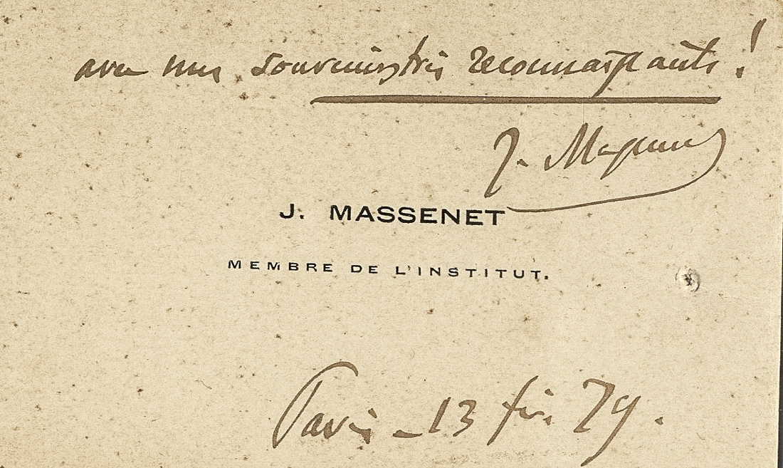 Massenet Jules, Biglietto da visita con dedica e firma autografa. Inviato al direttore de Il Secolo.