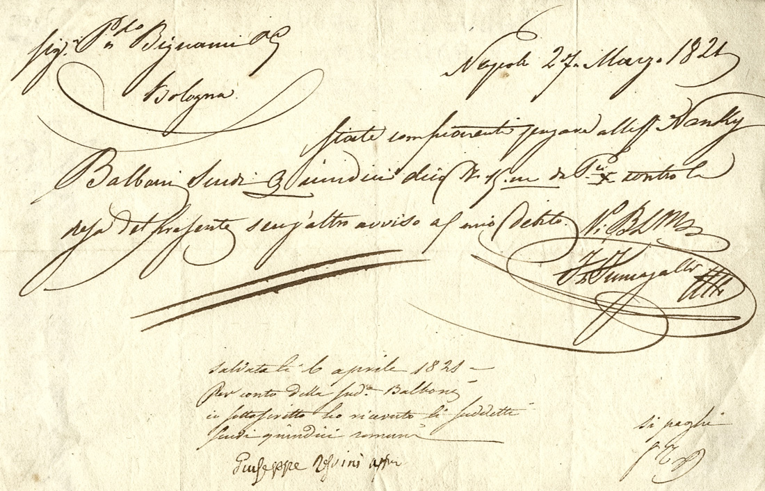 Rossini Giuseppe, Firma autografa su ricevuta di pagamento.