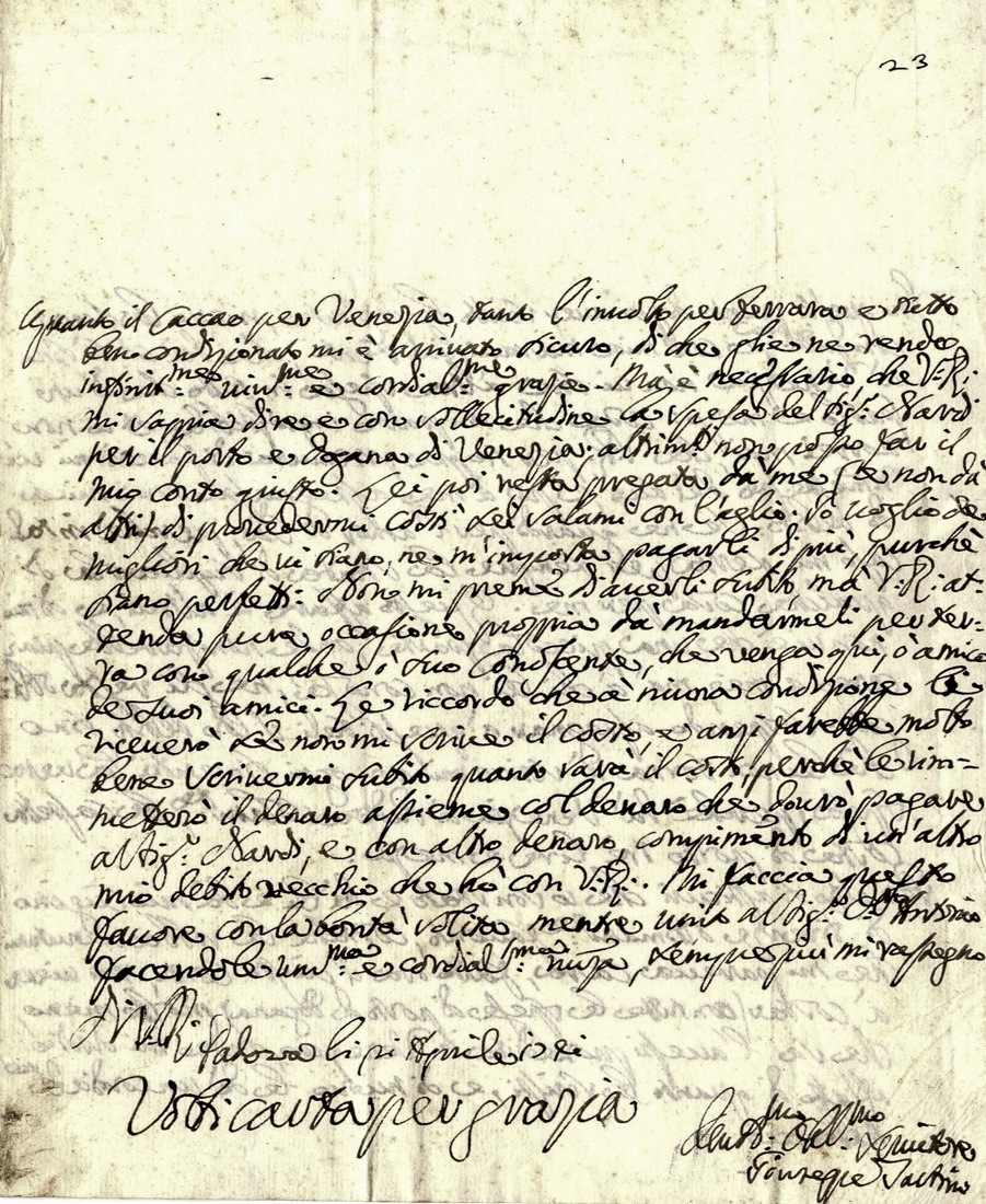 Manoscritto a inchiostro nero su carta con filigrana. 1 bifolio, scritte 2 pagine. Al verso della seconda carta il nome del destinatario. Alcune mancanze della carta senza perdita di testo a motivo della chiusura con ceralacca. Dimensioni: 225x162 mm.