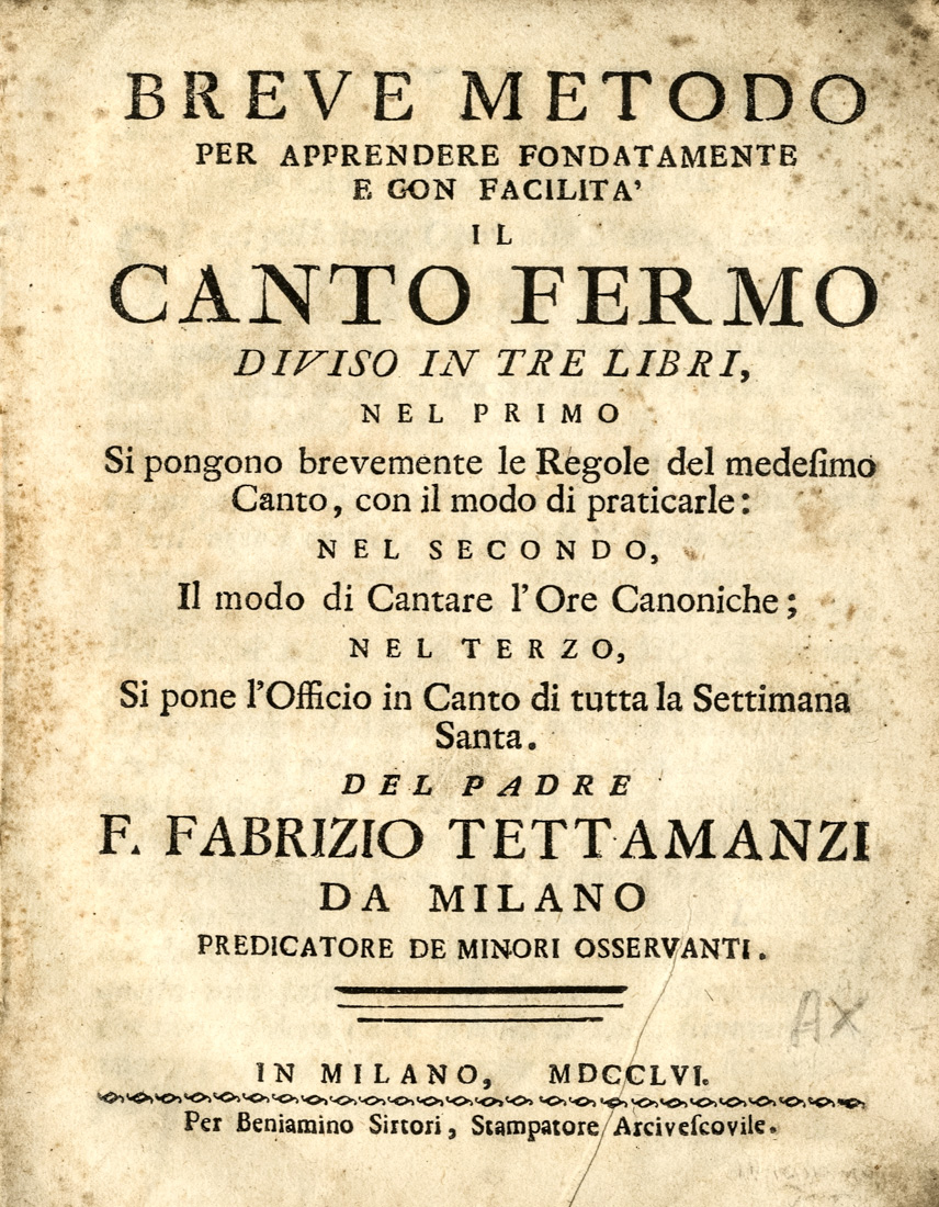 Tettamanzi Fabricio, Breve metodo per apprendere fondatamente e con facilità il canto fermo diviso in tre libri […].
