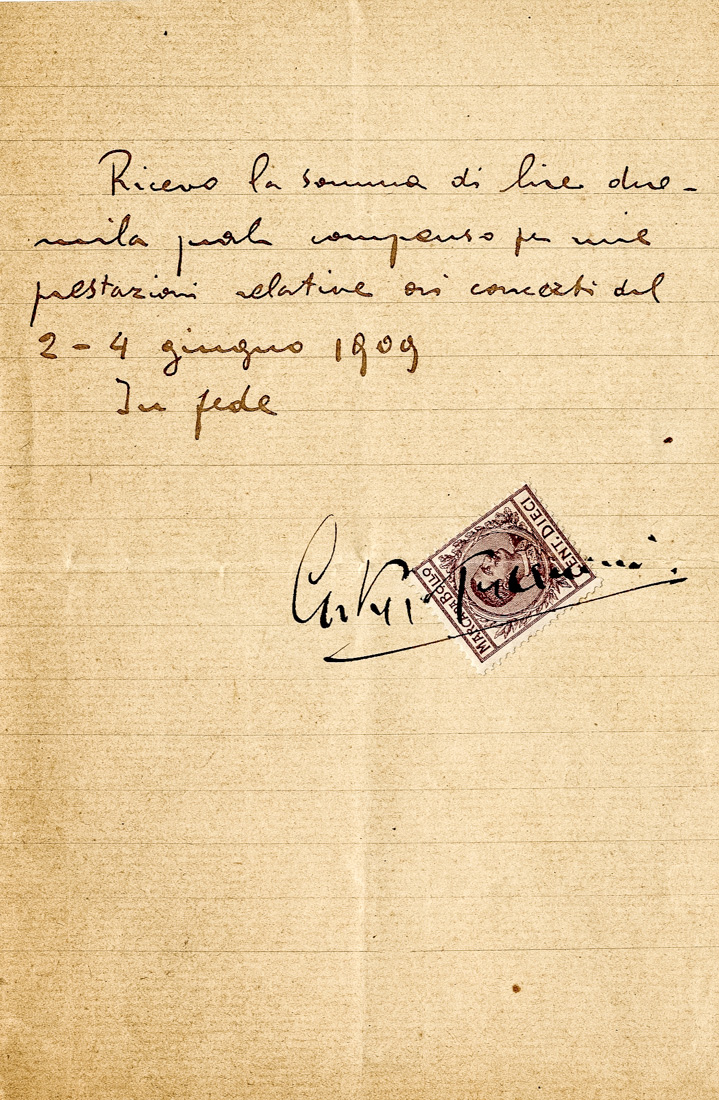 Manoscritto a inchiostro nero con marca da bollo. SI AGGIUNGONO: 4 ricevute di pagamento di musicisti che hanno prestato servizio nel concerto di Toscanini, insieme a 2 carte che contengono le spese complessive per i concerti di Toscanini. Datati 1909.(7)