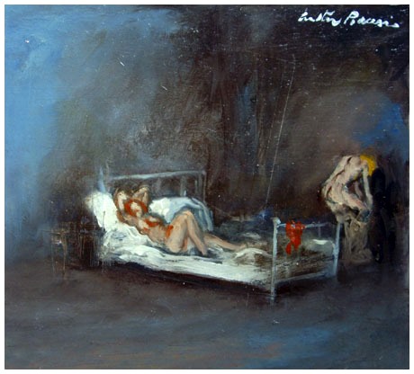 WALTER PIACESI Ascoli Piceno 1929 Interno con figure 1978 Olio su cartone 20,5 x 22,5. Firma in a. a d.; sul verso data, firme, titolo, tecnica e misure + timbro, firma e numero arch. Studio d’Arte Ca’Spinello, Ferminiano. Autentica dell’autore + etichetta Studio d’Arte Edizioni Cà Spinello, Fermignano su foto. B.A.: 500