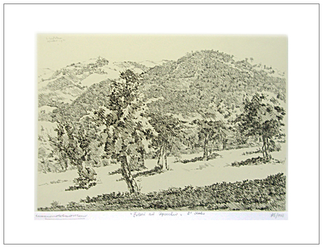 LEONARDO CASTELLANI Faenza 1896 – Urbino 1984 Filari ad Apecchio 1951 Acquaforte su fondino giallo paglia es.86/100 – 2° stato. Firma in b. a s., titolo in b. al c.; sulla lastra in a. a s. firma e data. (50 x 70 foglio – 26 x 36,5 inc.) Opera facente parte della cartella “6 acqueforti di Leonardo Castellani” Edizioni Ghelfi Verona. B.A.: 80