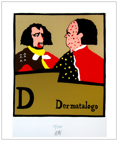FABIO DE POLI Genova 1947 Dermatologo Litografia a colori es.11/100. Firma in b. al c. (70 x 50 foglio – 45 x 41,5 lito.) L’opera fa parte della cartella “Fabio De Poli Ippocrate”, Stefanini & Stefanini Editore, Firenze, 1993. B.A.: 50