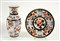 Gruppo composto da piatto e piccolo vaso con decorazione floreale, marchio apocrifo alla base, sec. XX (h. 22,5 cm.) (difetti)