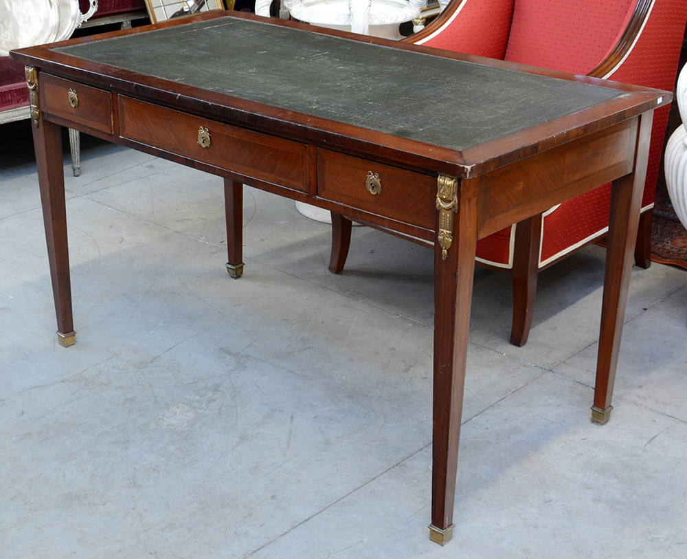 Tavolo scrittoio a tre cassetti con finiture in metallo dorato, gambe rastremate munite di scarpette. Piano in finta pelle impressa (cm 129,5x75,5x69) (difetti)