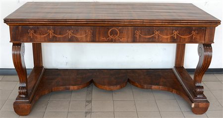 Consolle in noce e piuma ad un cassetto sottopiano decorato a festoni e fiocchi. Montanti scanalati poggianti su mensola mossa. Sec. XIX (cm 168x83x75) (difetti e restauri)