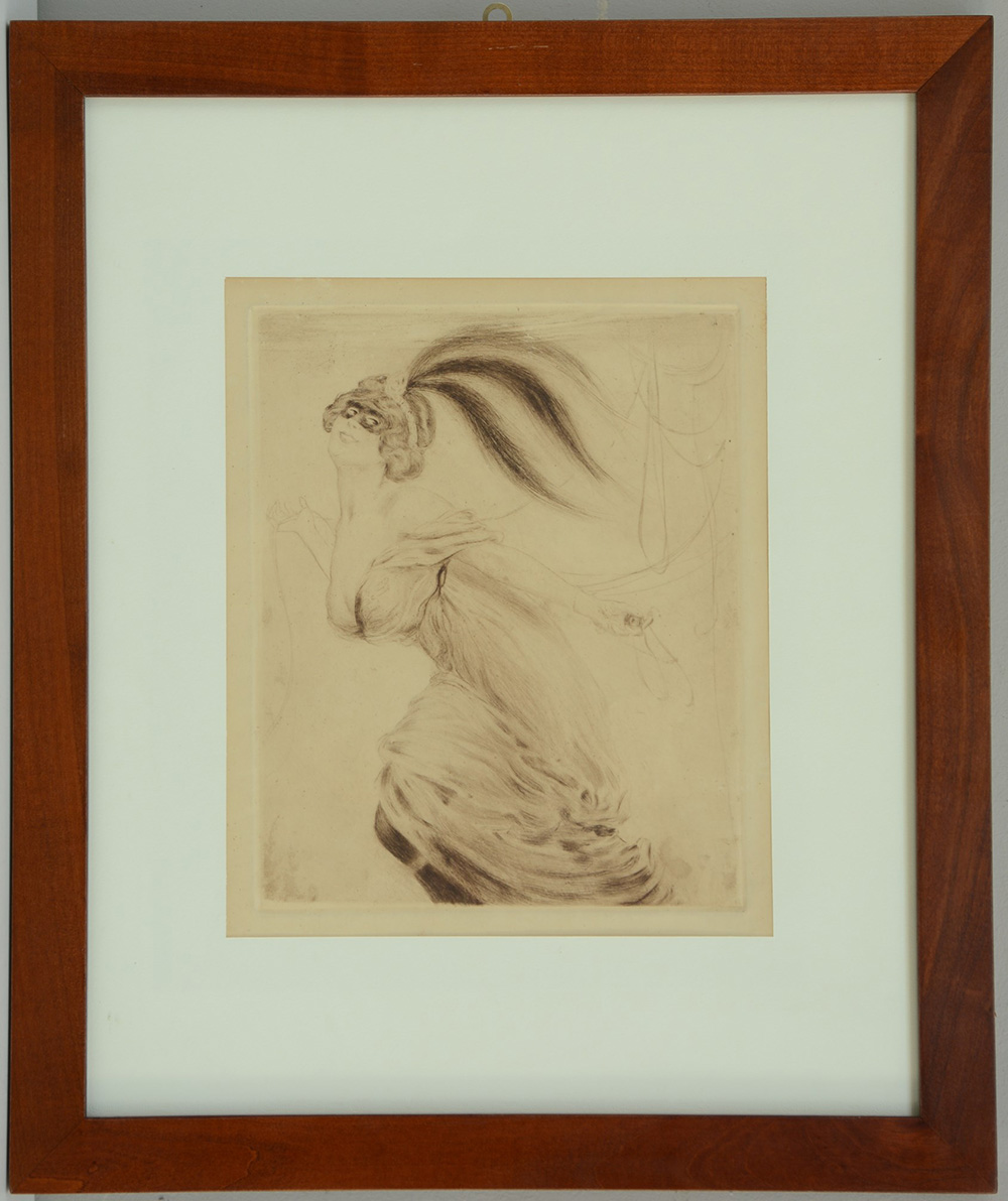 Puntasecca raffigurante una "Figura femminile in maschera" alla maniera di Maurice Bompard (battuta cm 32x26) in cornice (lievi difetti)