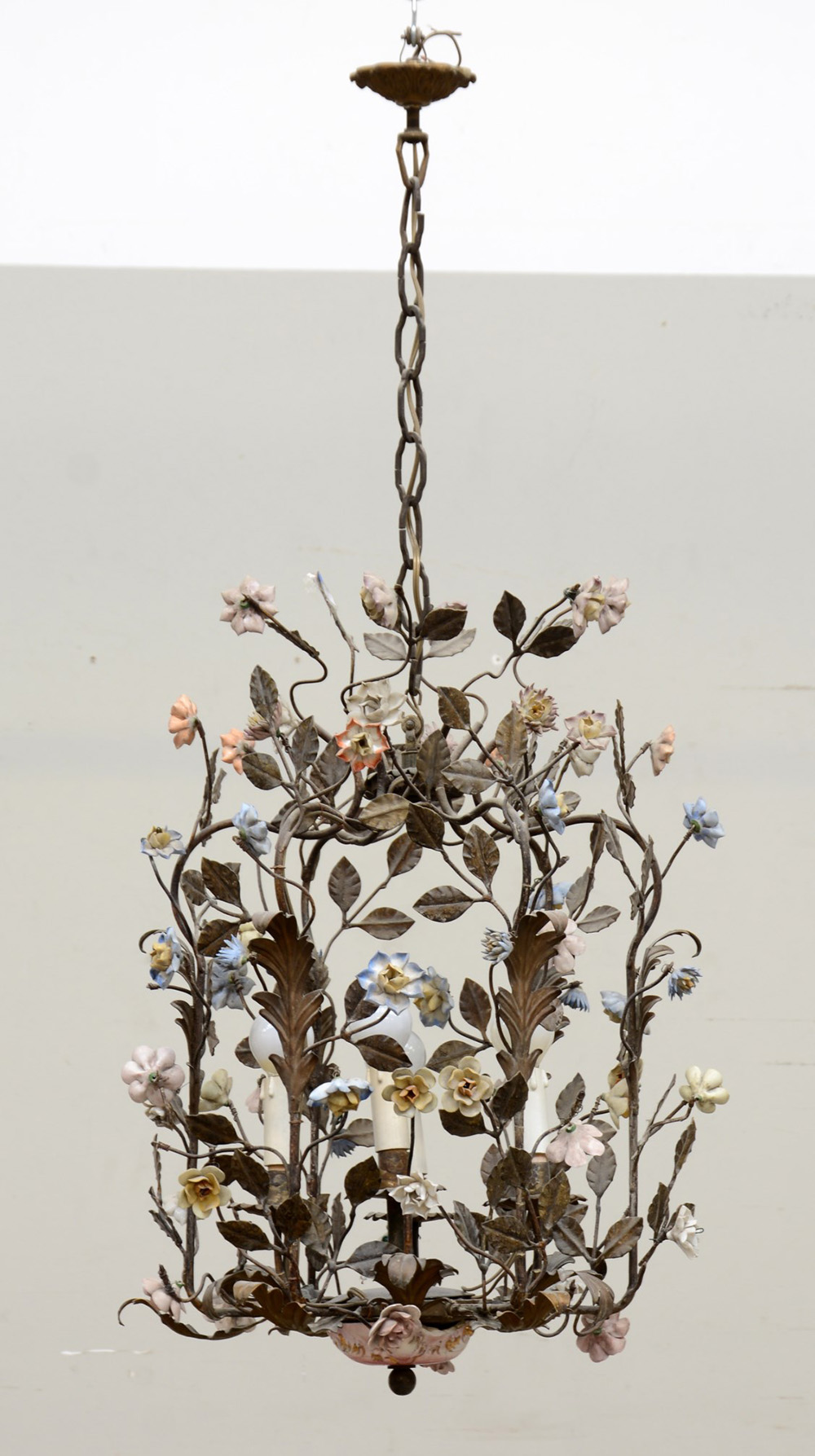 Lampadario in ferro battuto a foglie con fiori in ceramica policroma. Italia, sec XX (h cm 55) (difetti)