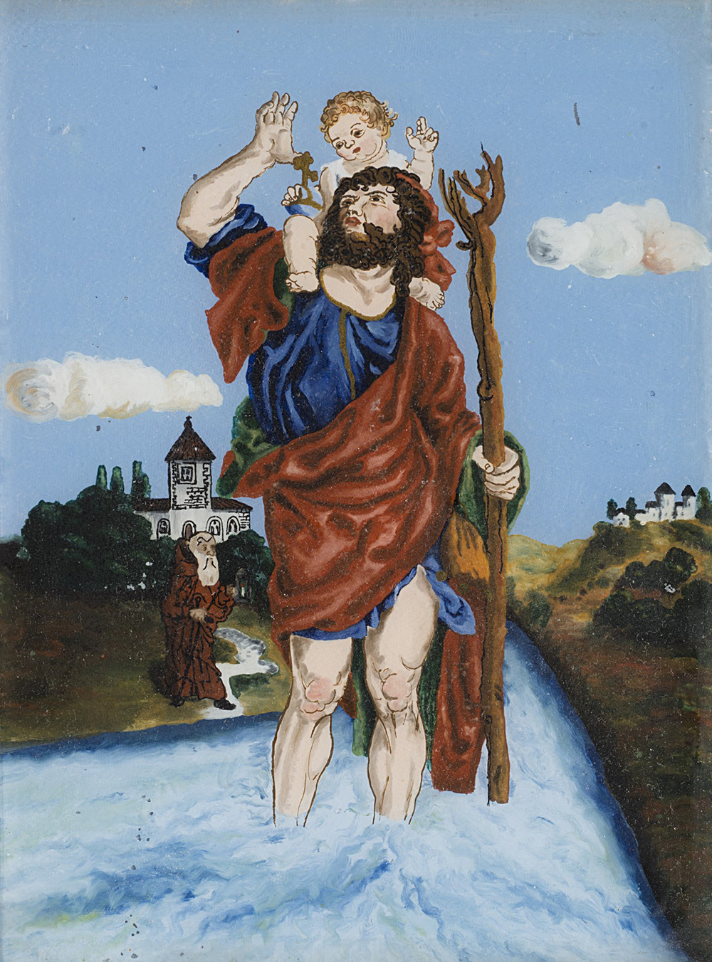 Arte popolare del sec. XIX "San Cristoforo" verre peinte (cm 24x20) In cornice