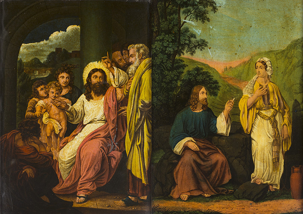 Coppia di fixÈs su vetro raffiguranti scene religiose (cm 31x22) In cornici in noce con profili dorati (difetti)