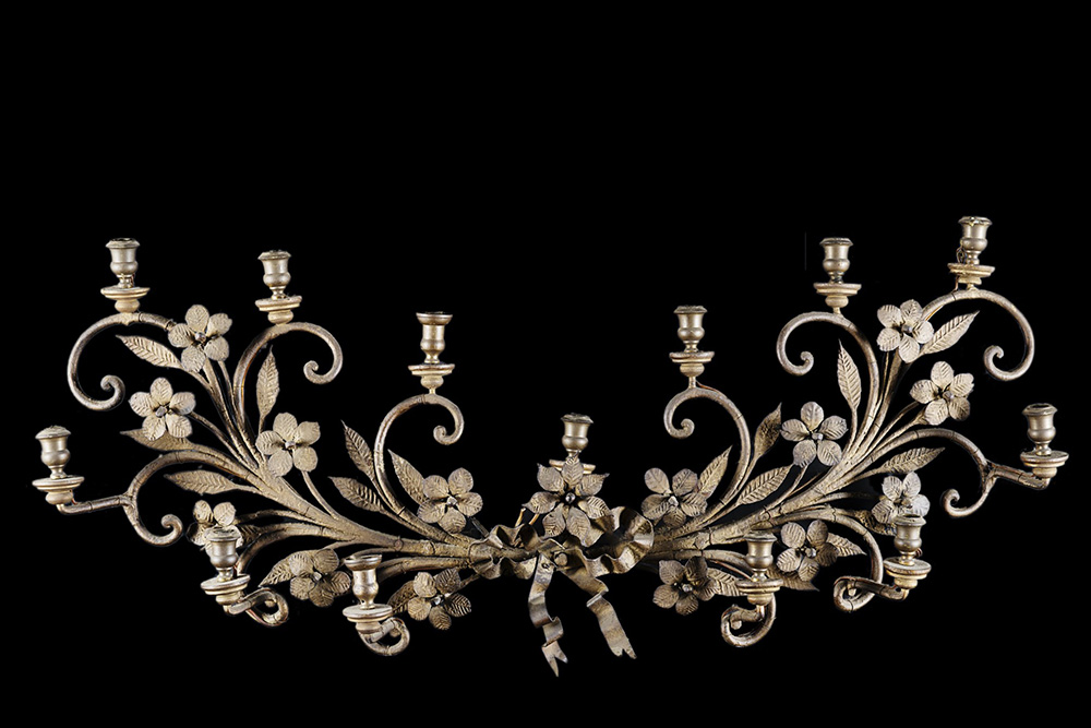 Applique a tredici fiamme in ferro battuto e dorato decorato a fiori e nastri. Sec. XIX (cm 92)