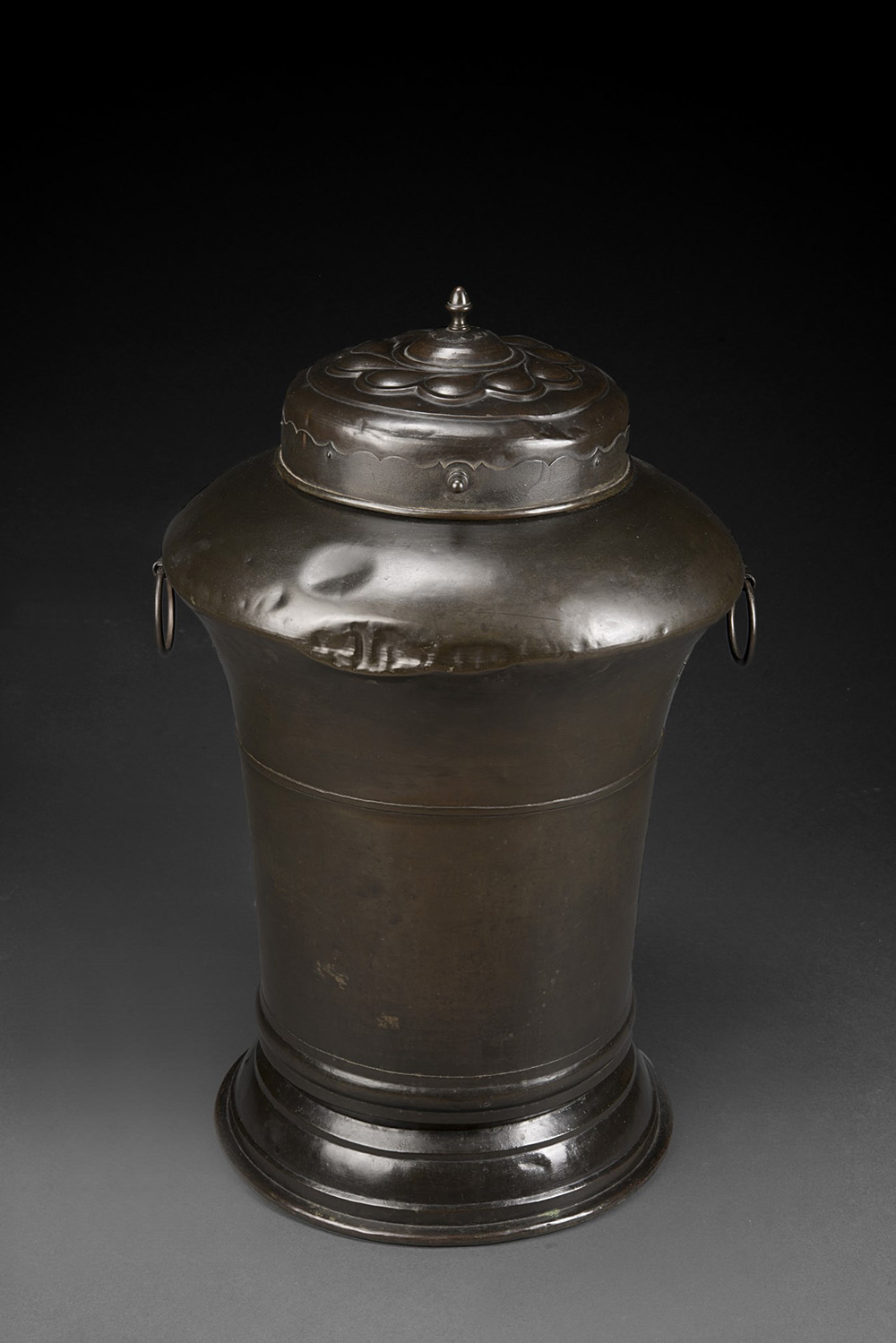 Lotto 107 | Antico contenitore biansato in rame con coperchio sbalzato a gocce stilizzate...