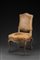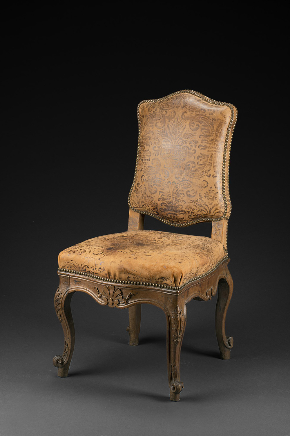 Sedia in noce con schienale sagomato, fasce e gambe mosse intagliate a foglie stilizzate e valva di conchiglia. Piedi a ricciolo. Rivestite in pelle impressa a vasi fioriti e volute. Sec. XVIII (difetti)