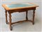 Tavolo da centro in noce e radica con fasce sagomate. Gambe sfaccettate riunite da traverse. Piano in velluto. Sec. XIX (cm 120x80x76) (difetti e mancanze)