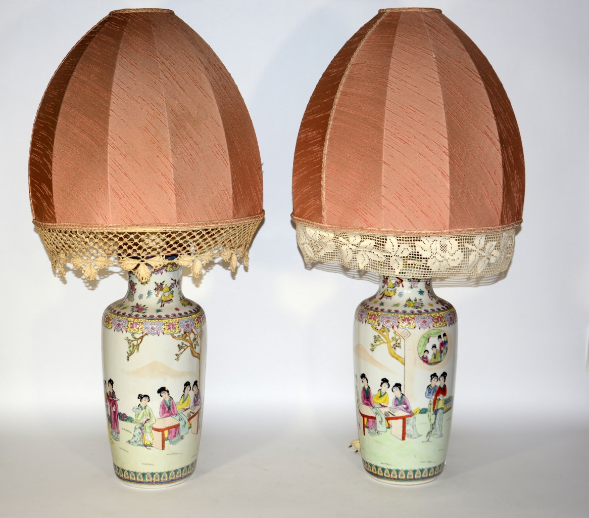 Coppia di vasi Famiglia Rosa con figure femminili, montati a lampada Cina, sec. XX (h. 46,5 cm.)